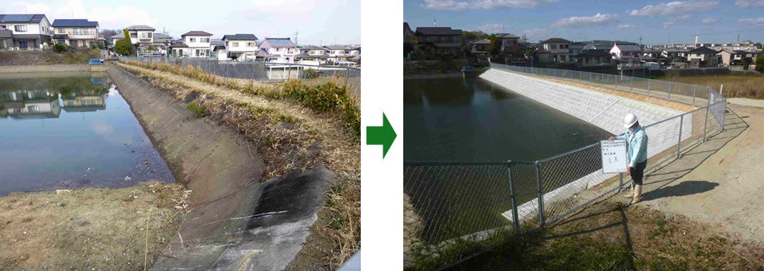 - ため池の取水施設(底樋、斜樋、取水路等)、護岸工の補修、堆積土砂浚渫